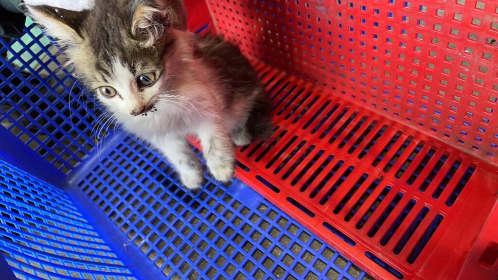 その日に2度目になる修理工場にバスは持っていかれ、そこで漸く元気なネコちゃんを見つけ出すことが出来ました。夜中、下からバスの横のフレームと呼ばれる場所に潜って入ったようですが、狭くて身動きが取れず自力で降りて来ることが出来なかったようでした。そのようにして、せっかく聖母の騎士幼稚園の狭い門から入って来てくれたネコちゃんでしたが、自由に生きるべく、元のネコバス停へと無事に戻って行きました。